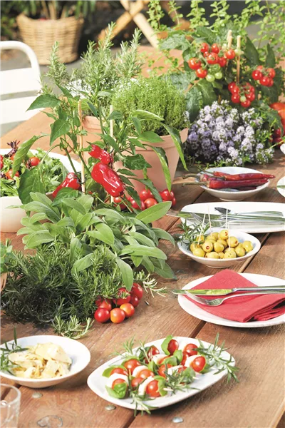 Daneben wachsen die aromatischen GRILLRKÄUTER. THYMIAN (Thymus), ROSMARIN (Rosmarinus), SALBEI (Salvia) und OREGANO (Origanum) lieben Wärme und gut drainierte Erde. In eher magerem Substrat bilden sie besonders viele ätherische Öle. Deshalb duften sie so intensiv beim Zerreiben der Blätter. Regelmäßiges Gießen ohne Staunässe und eine ausgewogene Nährstoffversorgung halten Gemüse wie Kräuter vital. So wird aus der Tischdekoration eine kleine Erntezone und der eigene Platz im Garten fühlt sich an wie Urlaub im Grünen.