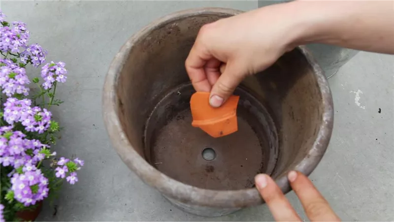 Bevor Sie frische Blumen- oder Balkonpflanzenerde aus dem Fachhandel in den Topf füllen, sollten Sie das Loch so abdecken, dass es nicht verstopfen kann.
