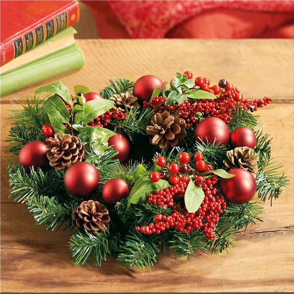 Wenn die Tage kürzer werden, sorgt das Windlicht in zwei Größen für wohltuende Gemütlichkeit. Das grüne Glas mit eingeprägtem Tannenmotiv fängt den warmen Schein der Kerze auf und wirft ein stimmungsvolles Lichtspiel in den Raum. Ob einzeln oder in Kombination aufgestellt entsteht eine wunderbare Winterstimmung. Ein festlicher Kranz in klassischen Rot-Grün-Tönen bringt sofort Weihnachtsstimmung ins Zuhause. Mit Zapfen, glänzenden Kugeln und leuchtend roten Beeren dekoriert, verbindet er Tradition mit verspieltem Retro-Charme. Als Tischdekoration oder an der Tür sorgt dieser Kranz für einen warmen Willkommensgruß und passt wunderbar zum nostalgischen Flair des Trends "SANTA’S LIST".